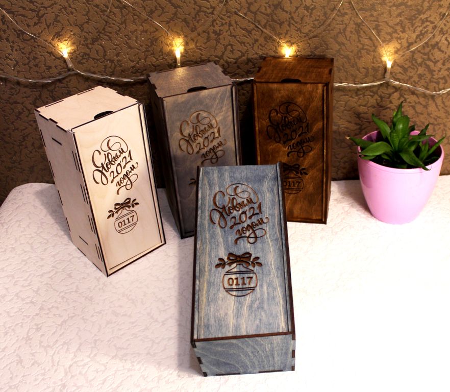 Деревянные подарочные коробки для бокалов с лазерной гравировкой. Комплекты выполнены в разных цветах, покрыты премиальным маслом для дерева. |