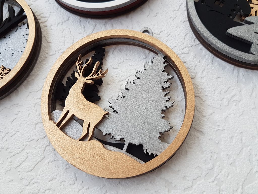 Многослойная елочная игрушка из фанеры "Олень в лесу"