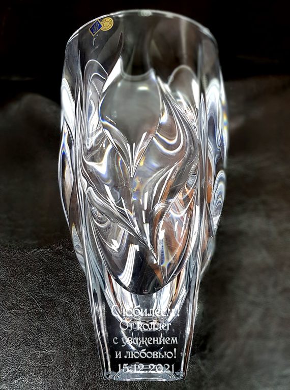Гравировка на вазе "С юбилеем"; Подарок от коллег с уважением и любовтью!