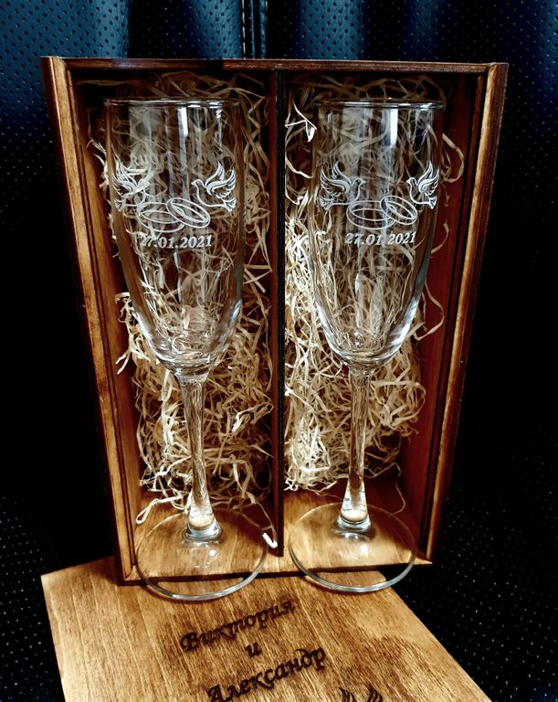 Свадебные фужеры с гравировкой в деревянной подарочной коробке