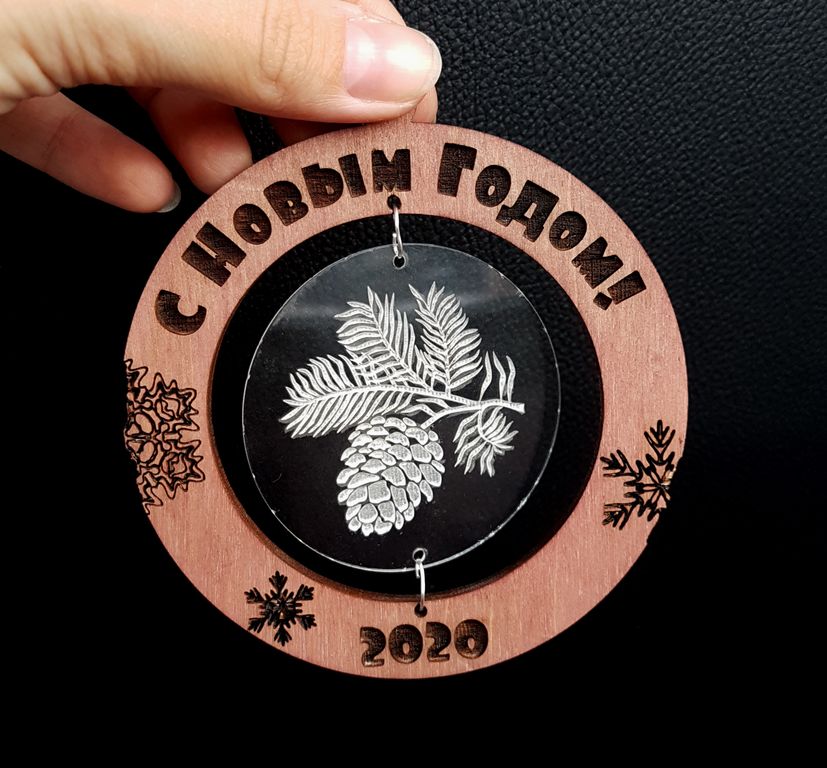 Игрушка на елку новогодняя. Основа игрушки из фанеры, с гравировкой. Медальон выполнен из акрила, так же с лазерной гравировкой. Форма и вид игрушек могут быть абсолютно любыми |