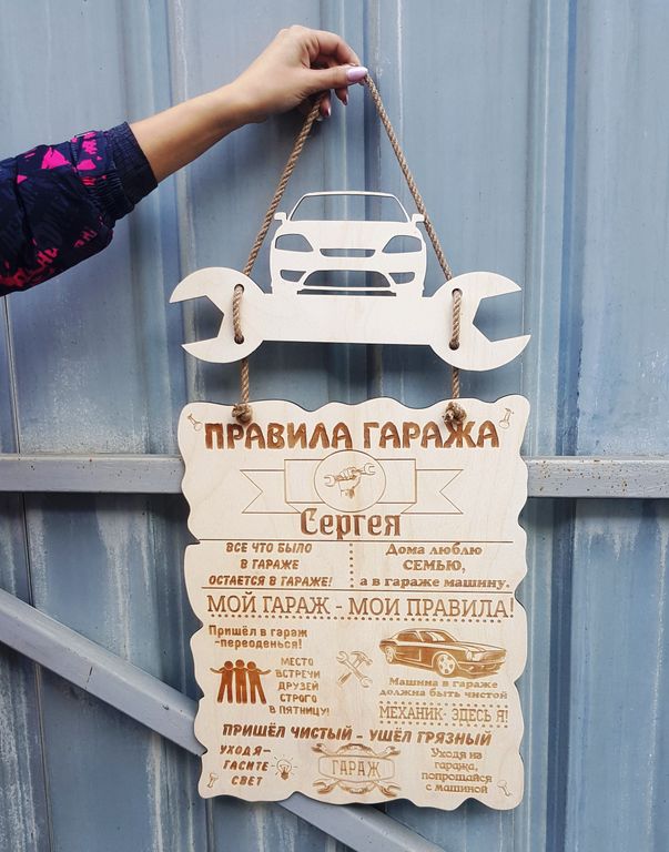 Правила гаража - оригинальный подарок для настоящего мужика; Выполнена из березовой фанеры 6 мм. Общий размер 68х40 см |