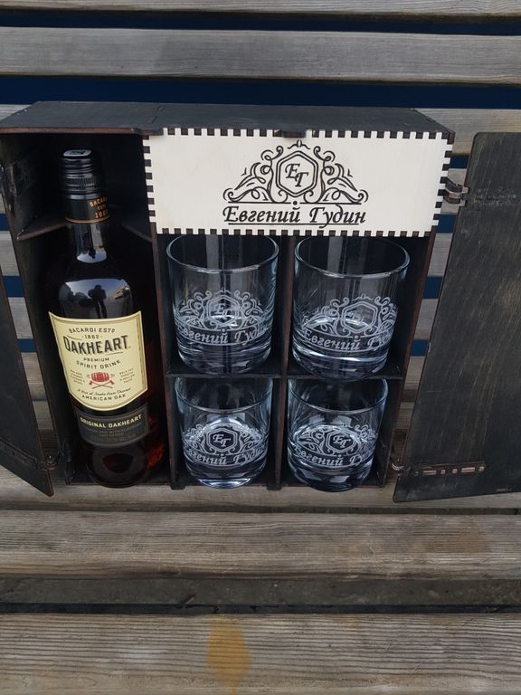 Подарочный набор в деревянной коробке с индивидуальной гравировкой. Ром и бокалы с инициалами владельца |